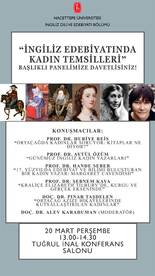 İngiliz Dili ve Edebiyatı bölümü hocalarının konuşmacı olarak katılacağı, 20 Mart 2025 Perşembe günü 13.00-14.30 saatleri arasında Prof. Dr. Tuğrul İnal Konferans Salonunda gerçekleşecek olan "İngiliz Edebiyatında Kadın Temsilleri" başlıklı panelimize tüm Hacettepeliler davetlidir.