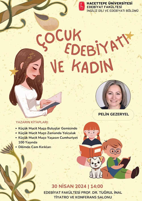 Üniversitemiz Edebiyat Fakültesi İngiliz Dili ve Edebiyatı Bölümü tarafından, 30 Nisan 2024 Salı günü 14.00'te Beytepe Yerleşkesi Edebiyat Fakültesi Prof. Dr. Tuğrul İnal Tiyatro ve Konferans Salonu’nda gerçekleştirilecek, Pelin Gezeryel'in konuşmacı olarak katılacağı “Çocuk Edebiyatı ve Kadın” başlıklı konuşmaya tüm Hacettepeliler davetlidir.