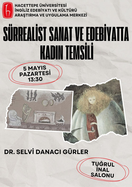 Değerli Hacettepeliler, Hacettepe Üniversitesi İngiliz Edebiyatı ve Kültürü Araştırma ve Uygulama Merkezi tarafından 5 Mayıs 2025 Pazartesi günü saat 13:30'da Prof. Dr. Tuğrul İnal Salonu'nda Dr. Selvi Danacı Gürler'in konuşmacı olarak katılacağı "Sürrealist Sanat ve Edebiyatta Kadın Temsili" başlıklı konuşmaya katılımınız bizleri onurlandıracaktır.