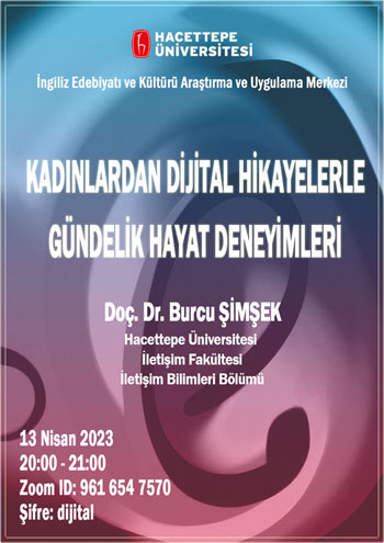 Üniversitemiz İngiliz Edebiyatı ve Kültürü Araştırma ve Uygulama Merkezi (İEKAUM) tarafından, 13 Nisan 2023 Perşembe günü saat 20:00-21:00 arasında Zoom platformu üzerinden Doç. Dr. Burcu Şimşek (Hacettepe Üniversitesi İletişim Fakültesi - İletişim Bilimleri Bölümü) tarafından gerçekleştirilecek olan "Kadınlardan Dijital Hikayelerle Gündelik Hayat Deneyimleri" başlıklı konuşmaya tüm Hacettepeliler davetlidir.