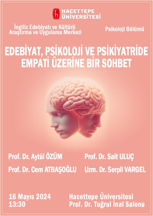 Hacettepe Üniversitesi İngiliz Edebiyatı ve Kültürü Araştırma ve Uygulama Merkezi (İEKAUM) ve Psikoloji Bölümü tarafından, 16 Mayıs 2024 Perşembe günü saat 13.30'da Prof. Dr. Tuğrul İnal Salonu'nda gerçekleştirilecek olan "Edebiyat, Psikoloji ve Psikiyatride Empati Üzerine Bir Sohbet" başlıklı panelimize katılımınız bizleri onurlandıracaktır.