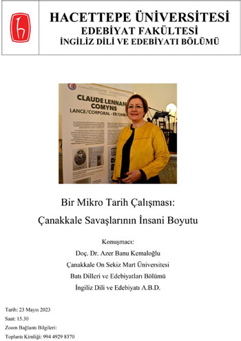 Bölümümüz tarafından 23 Mayıs 2023 Salı günü saat 15.30'da Zoom platformu üzerinden gerçekleştirilecek Çanakkale On Sekiz Mart Üniversitesi Batı Dilleri ve Edebiyatları Bölümü öğretim üyesi Doç. Dr. Azer Banu Kemaloğlu'nun "Bir Mikro Tarih Çalışması: Çanakkale Savaşlarının İnsani Boyutu" başlıklı konuşmasına tüm Hacettepeliler davetlidir.