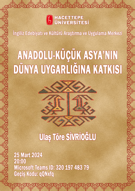 Hacettepe Üniversitesi İngiliz Edebiyatı ve Kültürü Araştırma ve Uygulama Merkezi (İEKAUM) tarafından, 25 Mart 2024 Pazartesi günü saat 20.00'da Microsoft Teams üzerinden arkeolog ve tarihçi Ulaş Töre Sivrioğlu tarafından gerçekleştirilecek olan “Anadolu-Küçük Asya’nın Dünya Uygarlığına Katkısı” başlıklı konuşmaya katılımınız bizleri onurlandıracaktır.